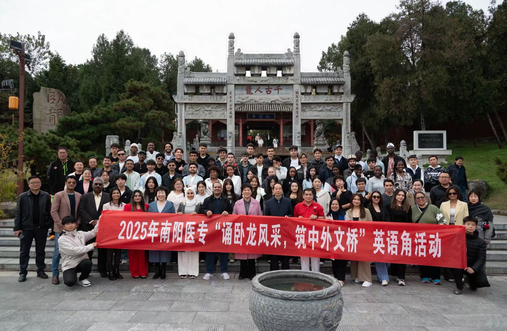 卧龙雄峙贯古今,文脉流芳润人心。国际教育学院2025年秋期第三次“诵卧龙风采,筑中外文桥”英语角活动于11月12日下午在南阳市卧龙岗景区举办。我校外教Hannalhay、Precious、Peachy Marie Casona等六位外教老师、我校留学生与英语爱好者踊跃参与,在参观交流之间开启了一场语言与文化的双向奔赴。