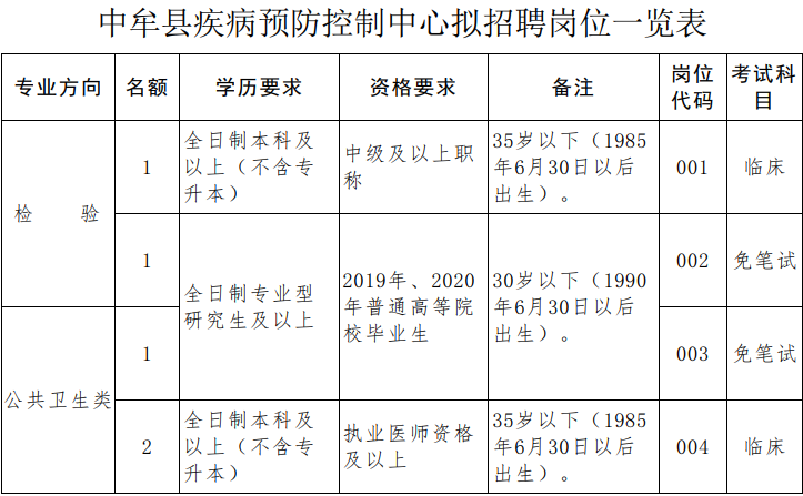 1 . 中牟县疾病预防控制中心拟招聘岗位一览表