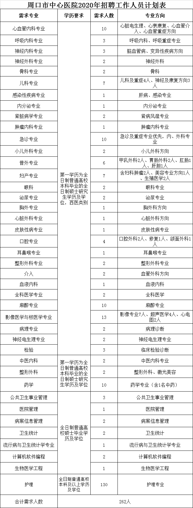本次招聘人员共计262名,其中临床、医技、药学、检验、医院管理、公共卫生事业管理等专业硕士132名,本科护理专业130名。具体招聘人数、专业、学历及要求,详见附表《周口市中心医院2020年招聘工作人员计划表》。