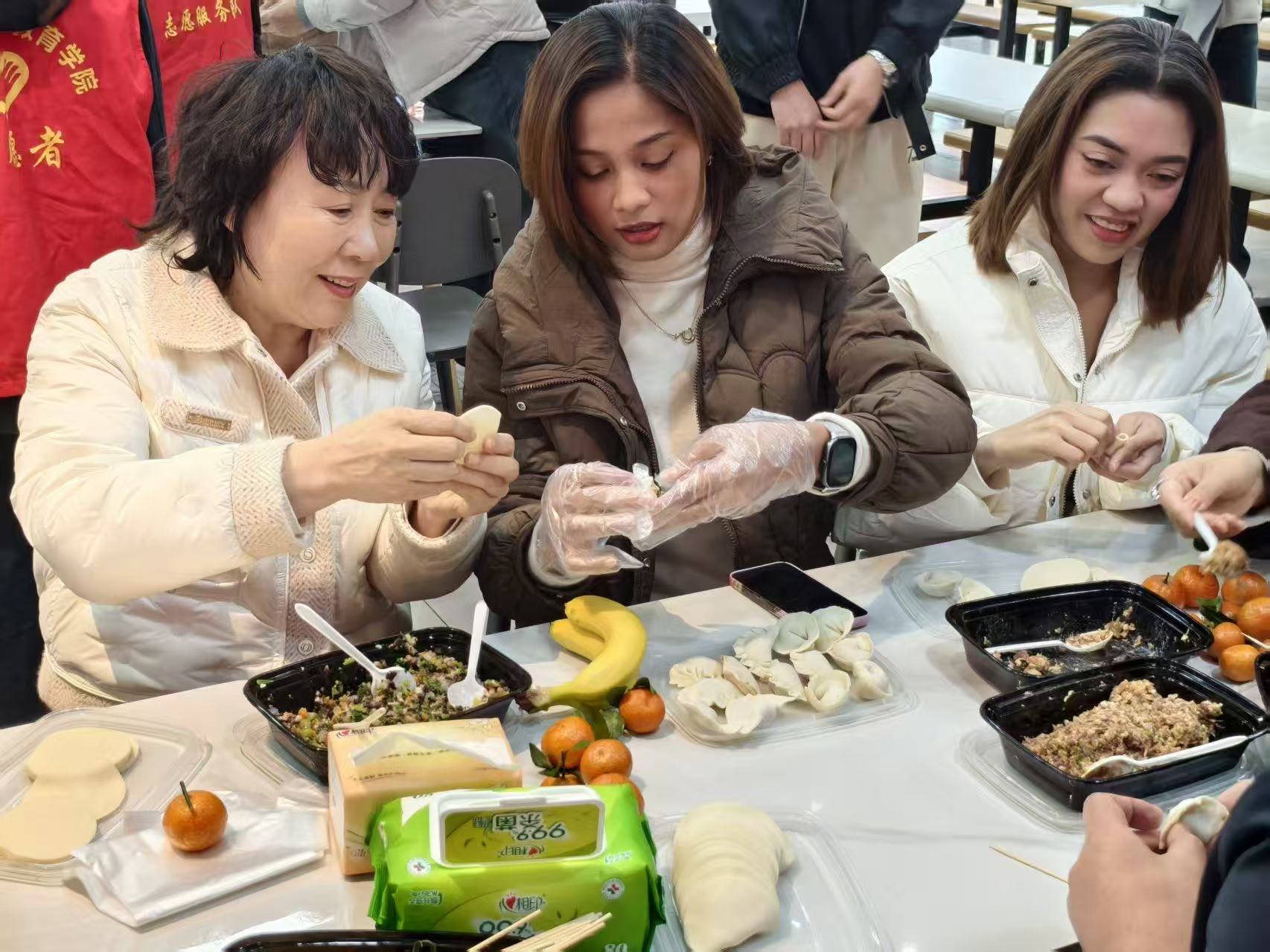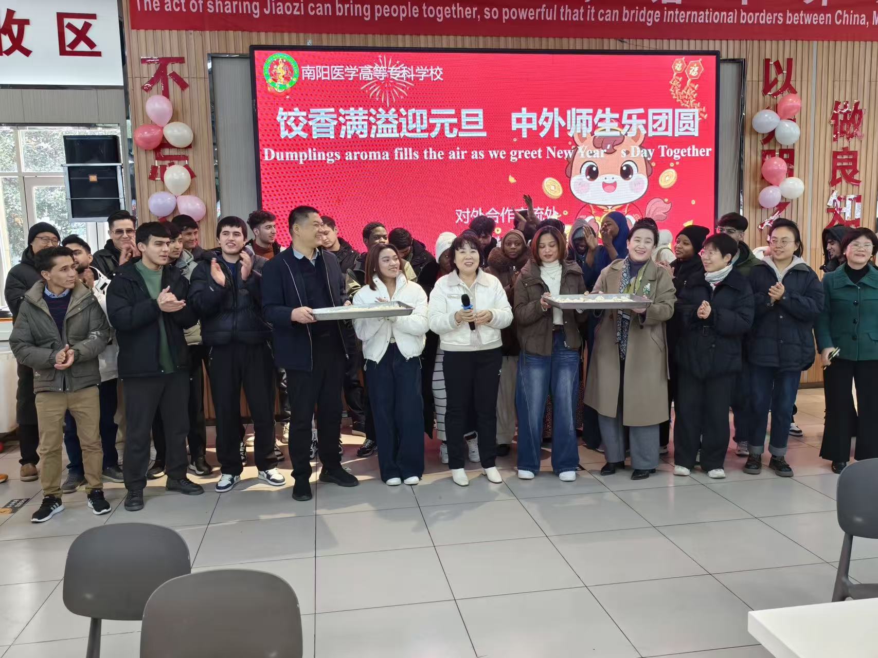 活动现场精彩纷呈,留学生们及羽人音乐社带来了活力满满的歌舞表演。中外师生齐唱《新年好》,熟悉的旋律传递出对新年的热切期盼,将现场氛围推向高潮。大家围坐一起包饺子,相互学习技巧、分享家乡习俗,在指尖互动中增进了解,餐厅内弥漫着饺子鲜香与真挚情谊。随后,大家共同品尝劳动成果,感受团圆温暖。