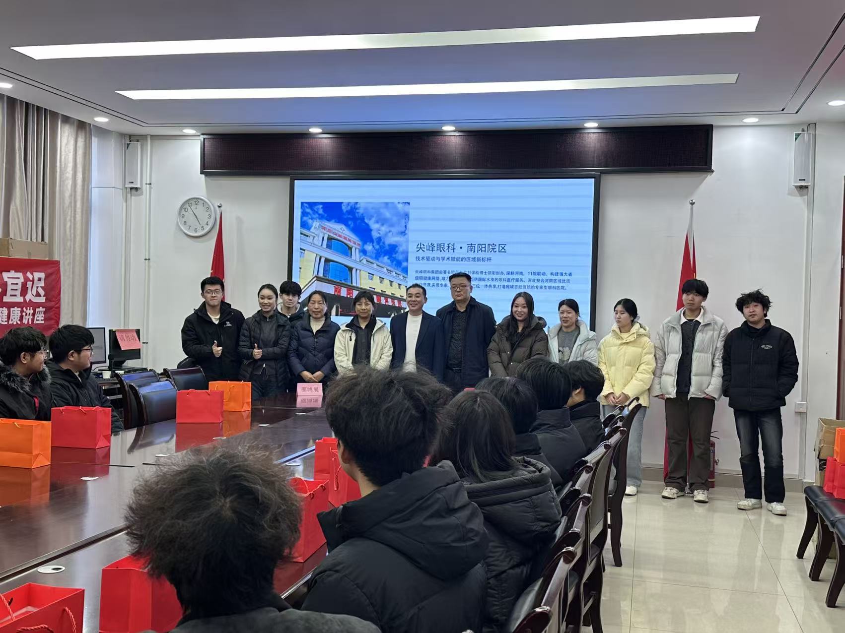 学院副书记张蕊介绍了学院概况、办学特色及毕业生就业情况。邵鸿展院长详细介绍了南阳尖峰眼科医院的发展历程、核心诊疗技术、先进诊疗设备、岗位任职要求等。他结合行业发展趋势,为在场学生提供了针对性职业发展建议,指导同学们深耕专业,锤炼本领。期待与国际教育学院建立良好稳定的合作关系,通过搭建实习就业平台等方式,吸纳更多优秀毕业生加入,为医院发展注入新鲜活力。